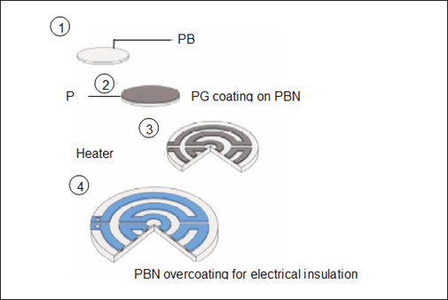 Pemanas komposit nitrida-pirolitik pirolitik (PBN-PG) adalah pemanas yang menggunakan PBN insulasi tinggi sebagai substrat dan menggunakan dekomposisi termal bertekanan rendah uap kimia uap (CVD) pada tekanan rendah (di bawah 10TorR) dan suhu tinggi untuk melingkarkan PG konduktif. Komponen utama dari pemanas komposit ini adalah pirolitik boron nitrida (PBN) dan grafit pirolitik (PG). Karena ketahanan korosi yang sangat baik dan resistensi suhu tinggi, ini terutama digunakan untuk pemanasan substrat semikonduktor (digunakan dalam MBE, MOCVD, lapisan sputtering, dll.); pemanasan substrat superkonduktor; Pemanasan sampel selama analisis sampel; pemanasan sampel mikroskop elektron; pemanas logam; Sumber pemanas penguapan logam, dll.