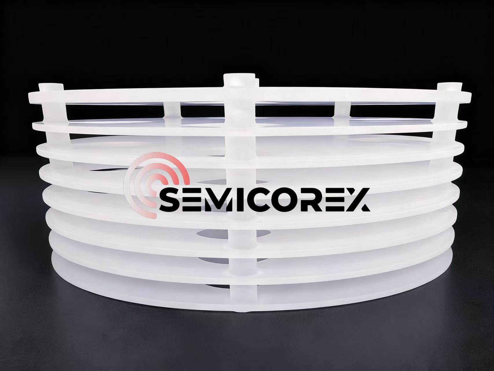 Wadah termos kuarsaterutama terdiri dari komponen inti seperti cangkang, alas, kolom pendukung, dan papan insulasi. Berkat desain kolom pendukung dan tonjolan posisi yang presisi, wadah termos kuarsa mengamankan pembawa wafer silikon dengan kuat untuk memberikan dukungan yang andal, sehingga mencegah perpindahan selama proses pembuatan semikonduktor suhu tinggi. Sementara itu, struktur isolasi berlapis-lapisnya secara efektif meminimalkan kehilangan panas dan mempertahankan suhu tungku yang konsisten untuk memastikan ketebalan film yang seragam untuk wafer silikon selama pemrosesan. Elemen penting yang menjamin keakuratan prosedur pembuatan semikonduktor dan kualitas produk adalah wadah termos kuarsa Semicorex.