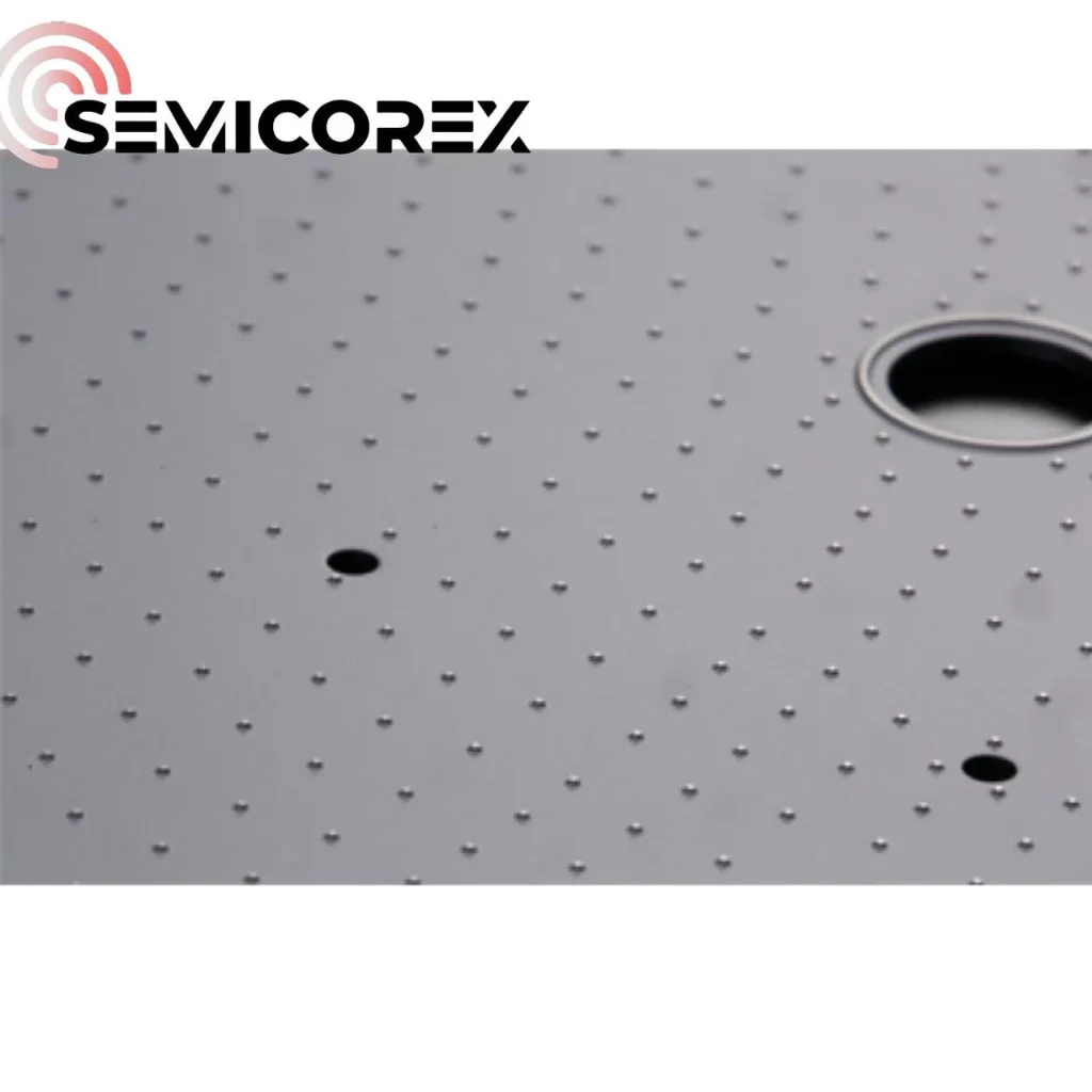 Permukaan Semicorexsilikon karbidapin chuck tersusun dengan banyak tonjolan berukuran mikron. Area kontak diminimalkan karena kontak dengan bagian belakang wafer hanya terjadi pada bagian yang tidak rata, yang secara efektif menghindari goresan wafer, kontaminasi partikel, dan tanda yang tidak perlu.